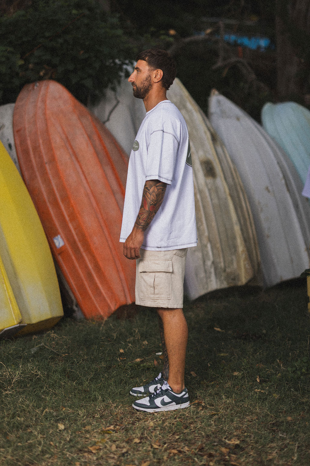 Introducing the Offseason Club T-Shirt in White. Crafted from premium cotton in a boxy oversized silhouette. Designed with refined detailing, including our small Offseason Club patch on the front left with our matching large patch on the back in green. Finished with contrast green reverse stitching along the neck, hem, shoulders, and sleeves, delivering a subtle yet distinctive expression of elevated resort-inspired streetwear.