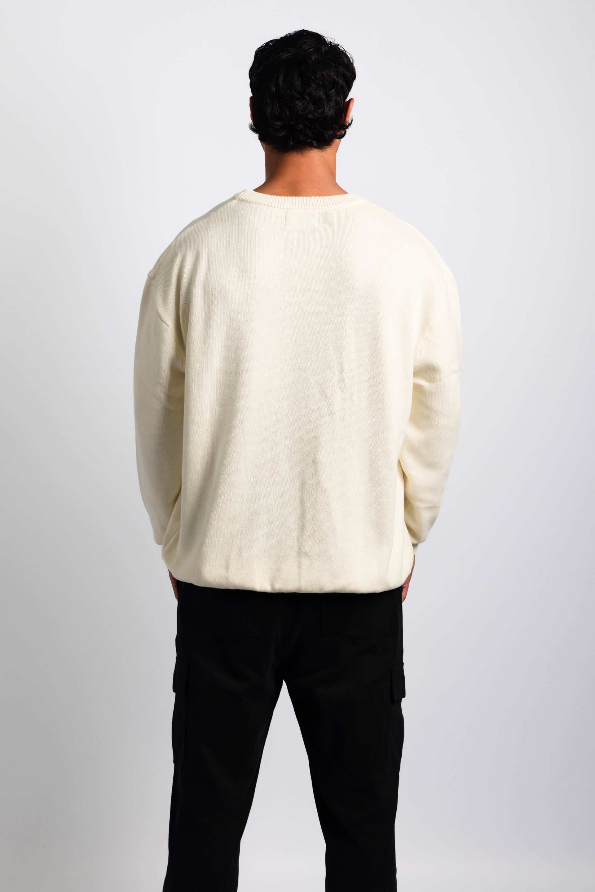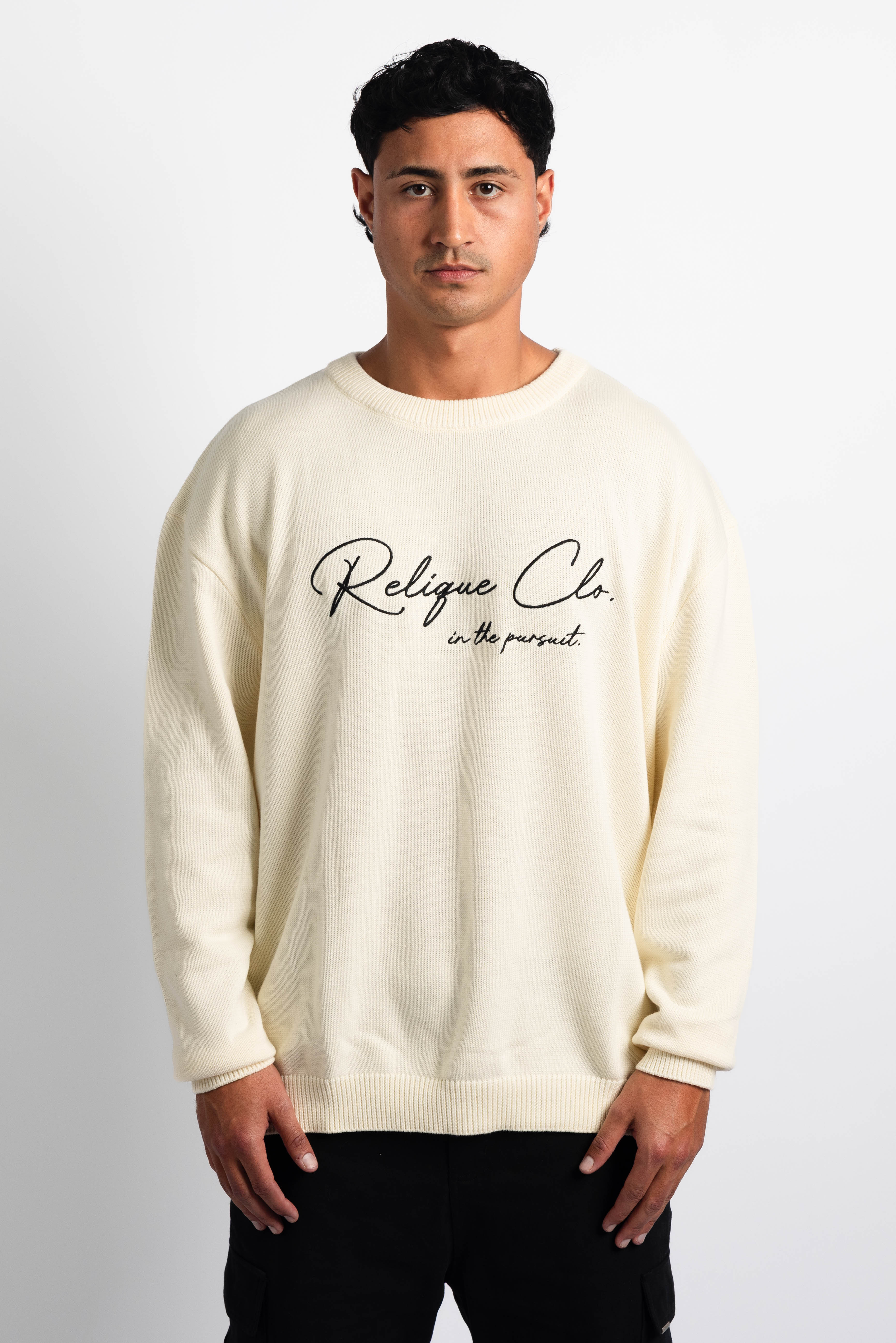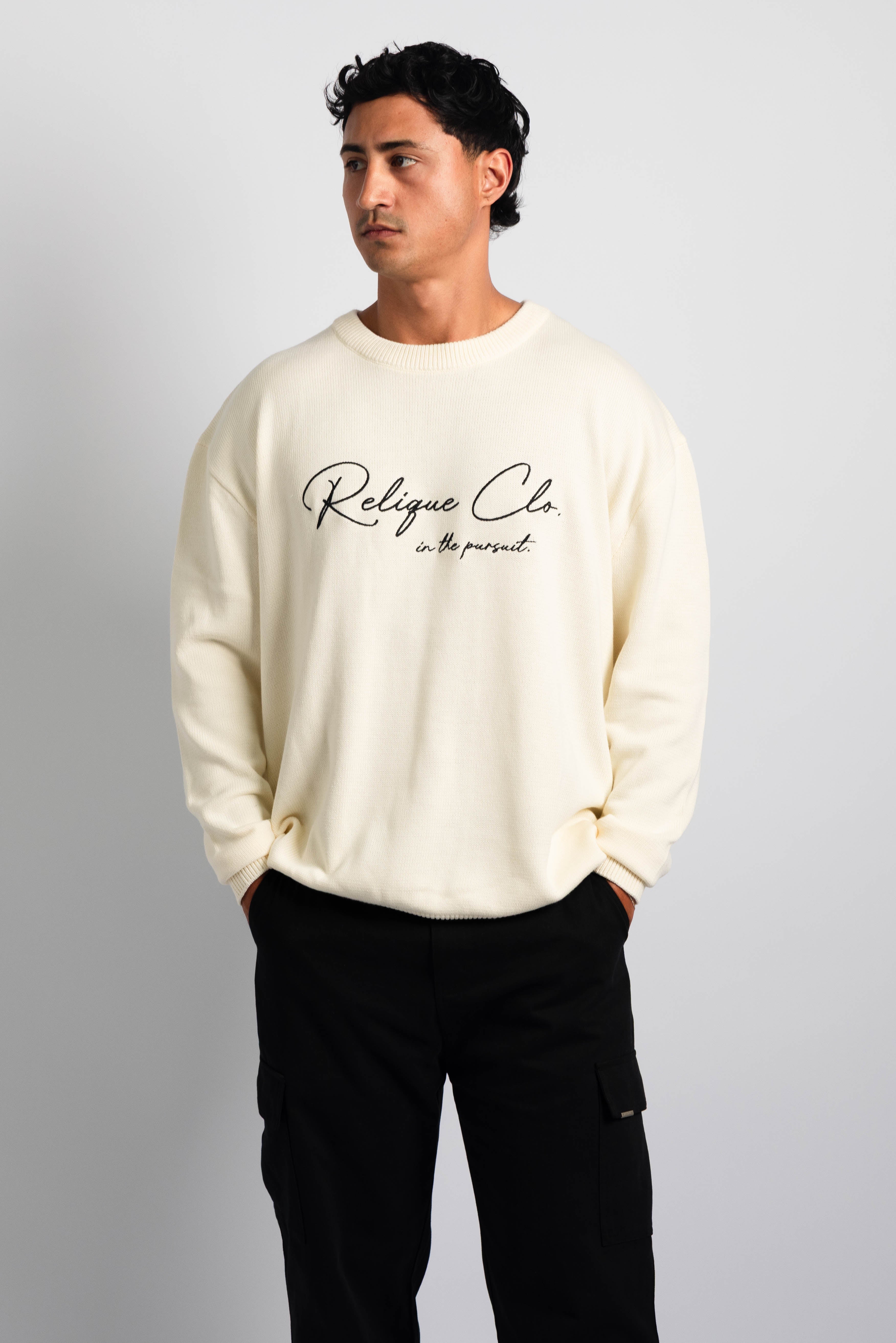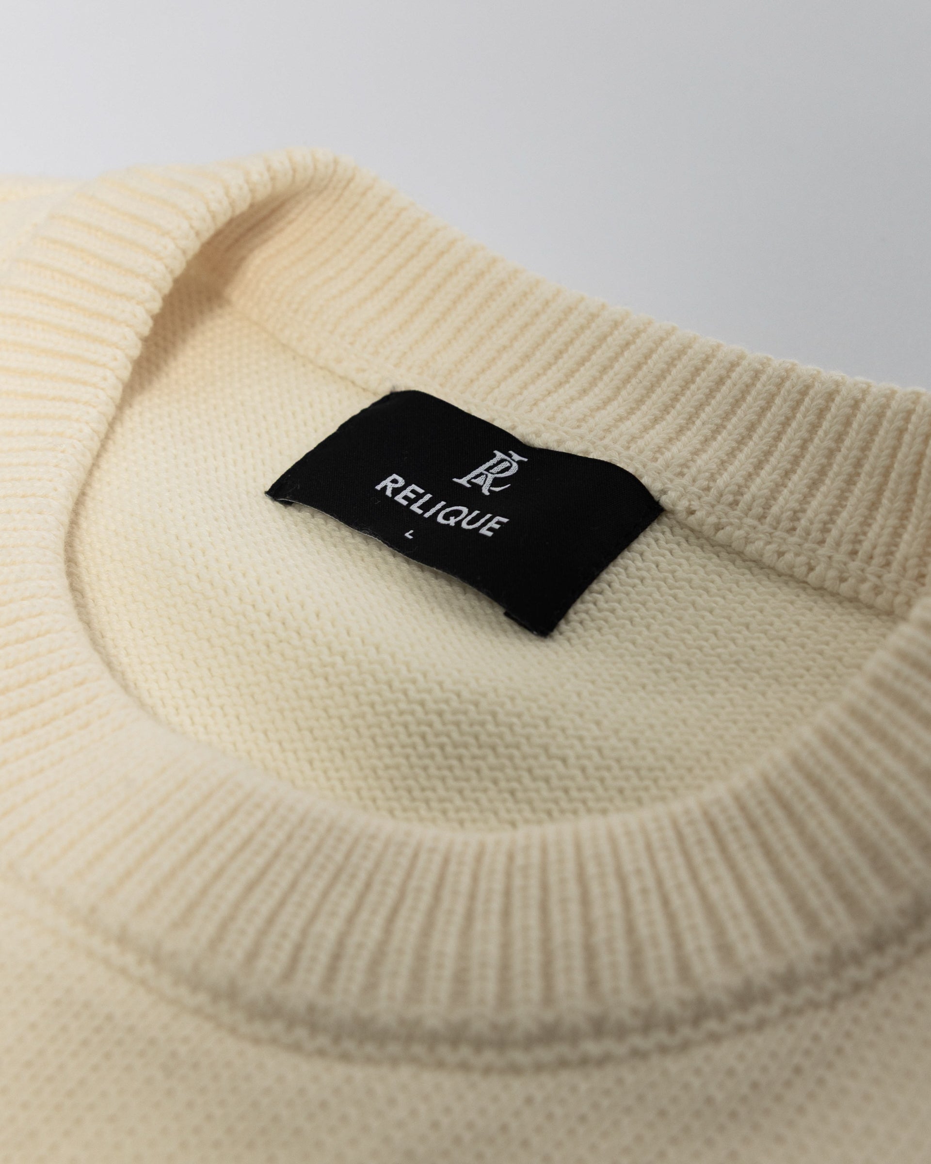 Introducing the Cream Relique Signature Knit Sweater, crafted from premium knit with a refined, slightly relaxed fit. Ribbed detailing at the collar, cuffs, and hem adds subtle structure, while intricate embroidery at the front elevates its sophisticated yet effortless appeal.